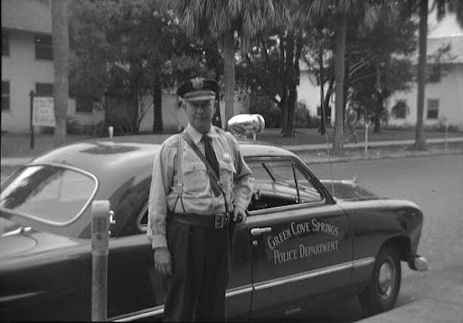 Green Cove Springs, FL. Police Officer standing next to his patrol car 1948